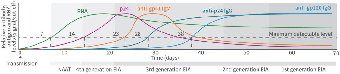 P24蛋白是一種構(gòu)成HIV的核心或“核衣殼”結(jié)構(gòu)蛋白。人體感染HIV病毒早期,血清中會(huì)出現(xiàn)高水平的P24抗原。因此通過(guò)檢測(cè)P24抗原可將HIV檢測(cè)窗口期提前至14天(如下圖),有利于在暴露后早發(fā)現(xiàn)HIV感染并及時(shí)進(jìn)行治療。