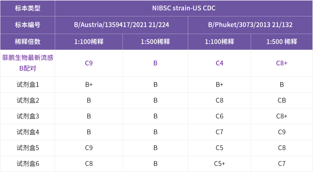 菲鵬生物流感B原料制備的試紙條與其他試劑盒對(duì)比數(shù)據(jù)