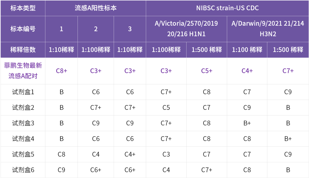 菲鵬生物流感A原料制備的試紙條與其他試劑盒對(duì)比數(shù)據(jù)