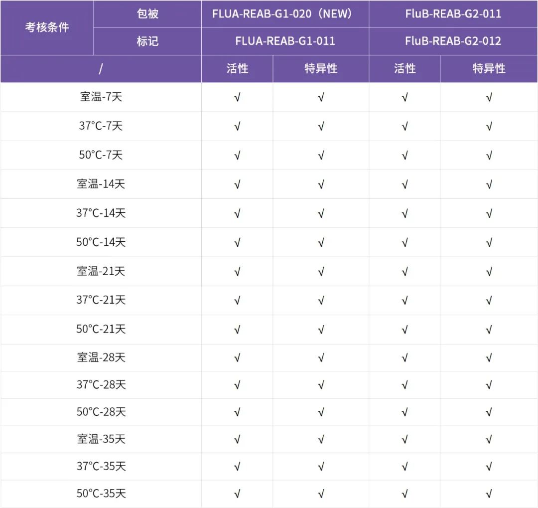 將菲鵬生物流感A與B配對(duì)產(chǎn)品在進(jìn)行反復(fù)凍融、超低溫保存時(shí)間、不同溫度與不同時(shí)間進(jìn)行考核后,產(chǎn)品物理性能無(wú)明顯變化,活性、特異性和交叉性均無(wú)變化,產(chǎn)品穩(wěn)定性?xún)?yōu)良。