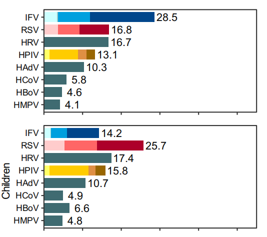 中國CDC于2021年在Nature Communications上發(fā)表了一項(xiàng)研究,通過對(duì)2009-2019年間全年齡段的急性呼吸道感染(ARI)患者進(jìn)行監(jiān)測,分析了231,107名合格患者的病原學(xué)和流行病學(xué)特征。結(jié)果表明,流感病毒(IFV)、RSV和人鼻病毒(HRV)是最主要的三大病毒性病原體,而在兒童群體中,RSV則位居第一。